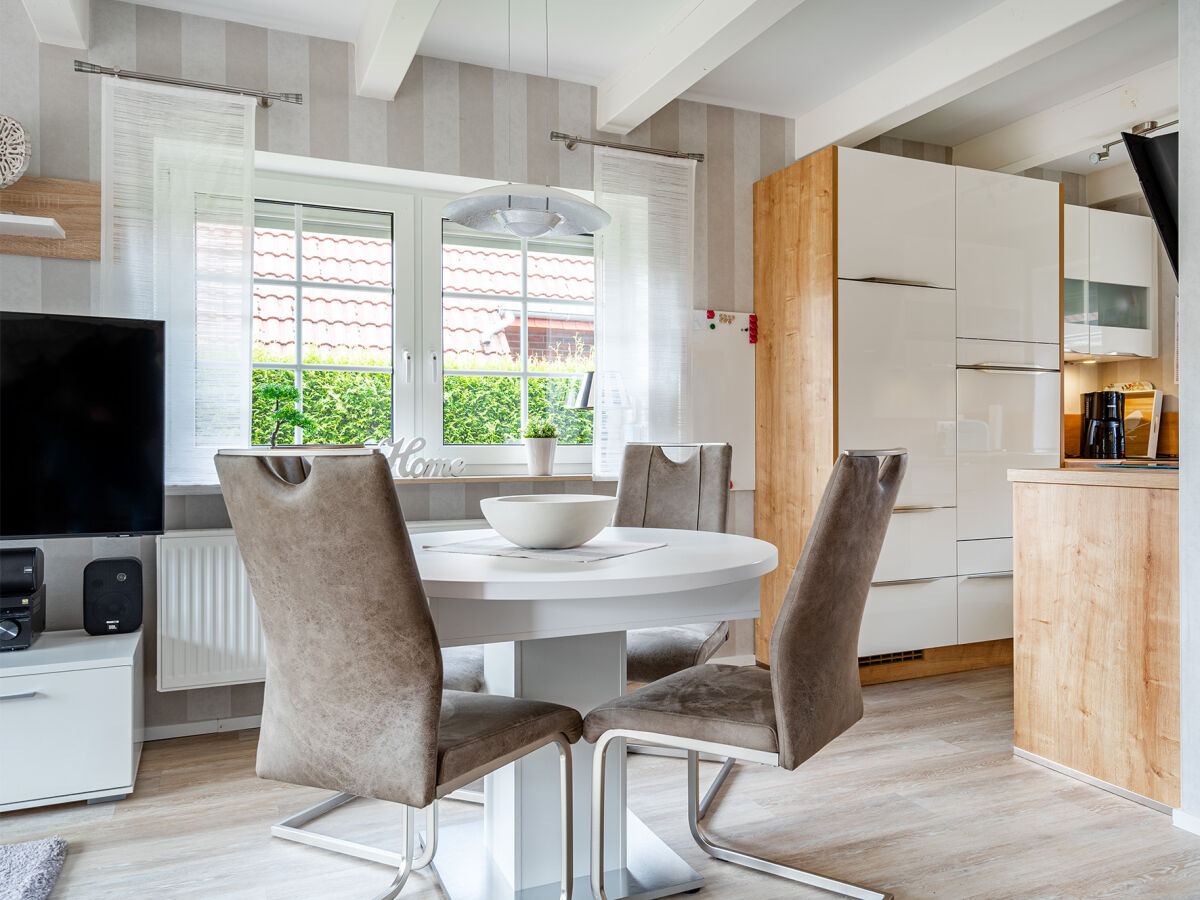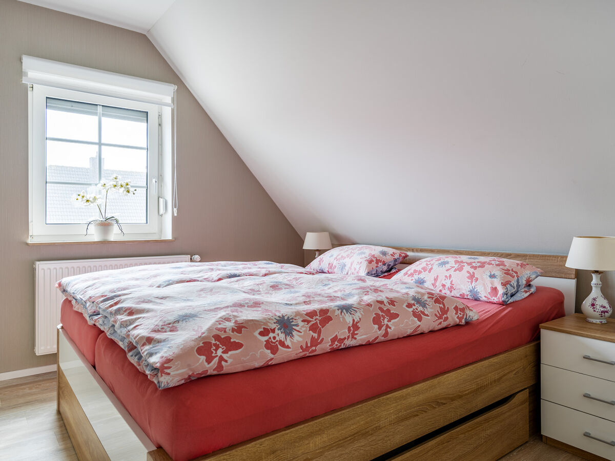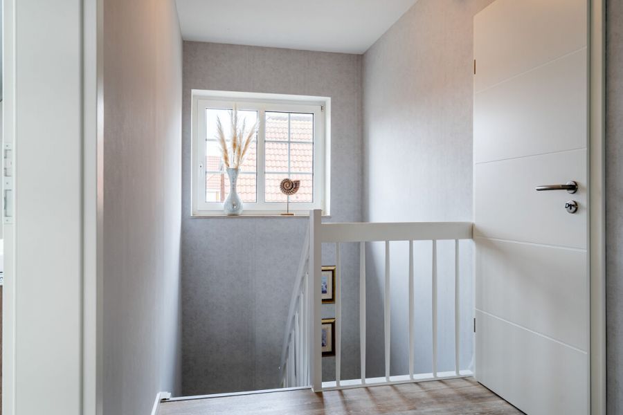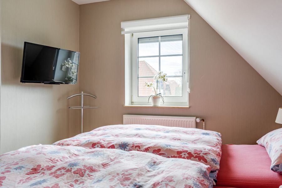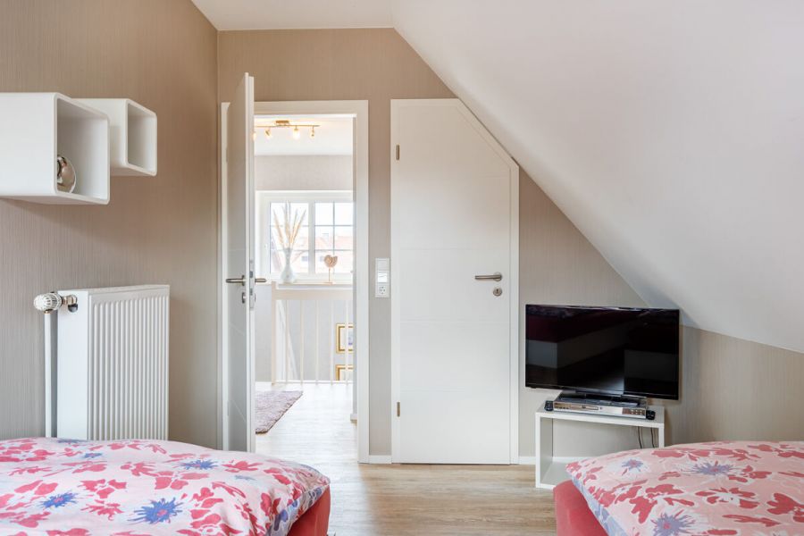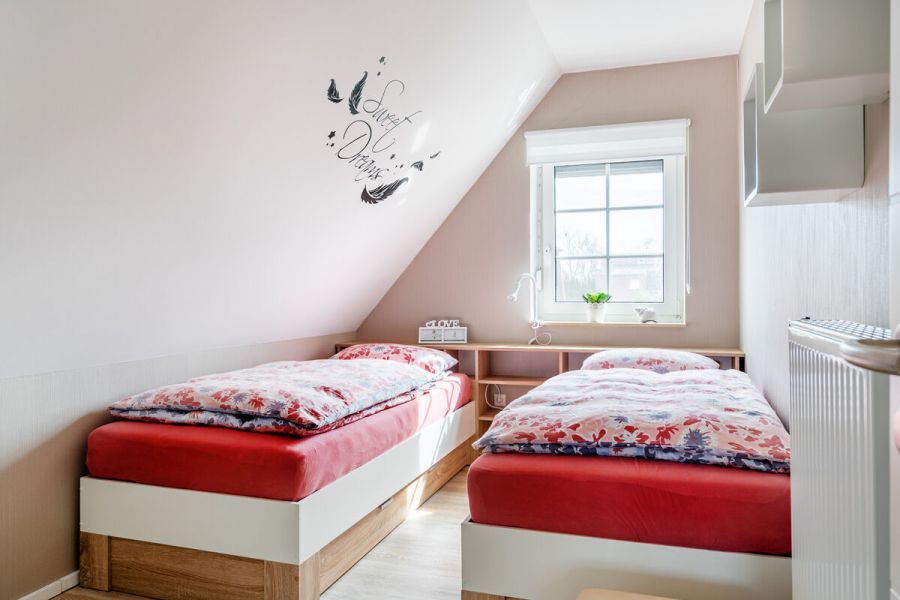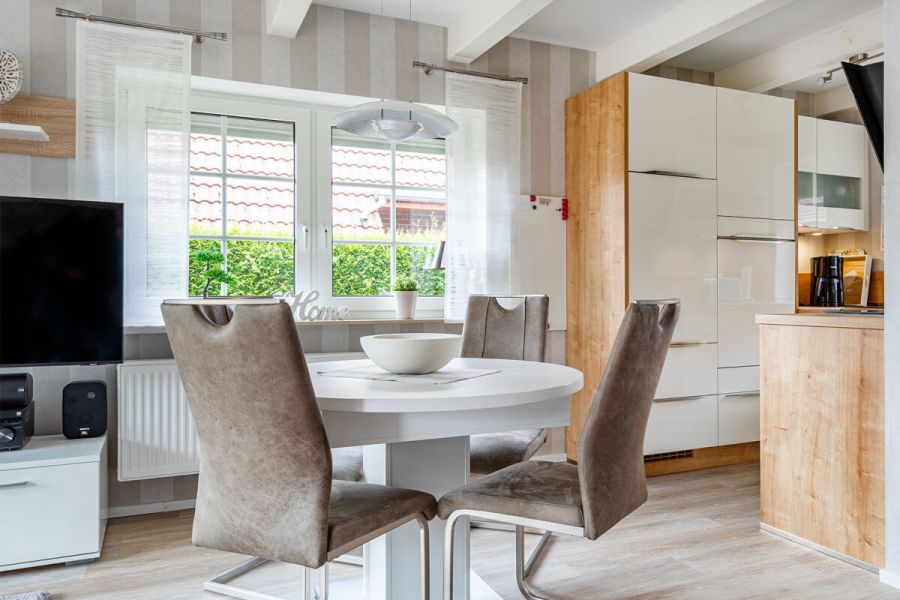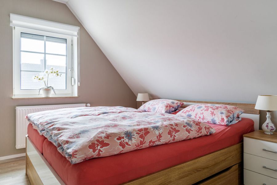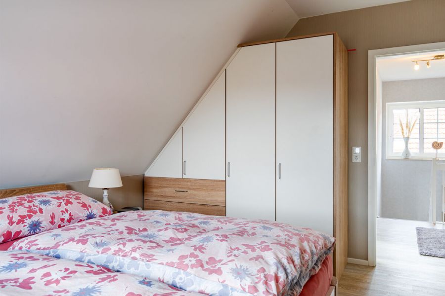 Dieses liebevoll eingerichtete und super ausgestattete Nichtraucherhaus bietet Ihnen auf ca. 80m² Wohnfläche Platz für bis zu 4 Personen mit Kleinkind. Das gesamte Haus ist mit pflegeleichtem Vinylboden ausgestattet. Der großzügige Wohn- und Essbereich mit Zugang auf die überdachte Außenterrasse und offener Küche lässt keine Wünsche offen. Abgerundet wird das Platzangebot im Erdgeschoss durch ein Gäste-WC und einem Abstellraum. Über eine Holztreppe gelangen Sie in das Obergeschoss. Hier befinden sich zwei toll eingerichtete Schlafzimmer und das moderne Badezimmer mit bodenebener Dusche. Die Schlafzimmer sind wie folgt ausgestattet: Das Elternschlafzimmer ist mit einem Doppelbett, einem Kleiderschrank und einem TV-Gerät ausgestattet. Das Kinderzimmer mit zwei Einzelbetten, einem kleinen begehbarem Kleiderschrank und ebenfalls mit einem TV-Gerät.