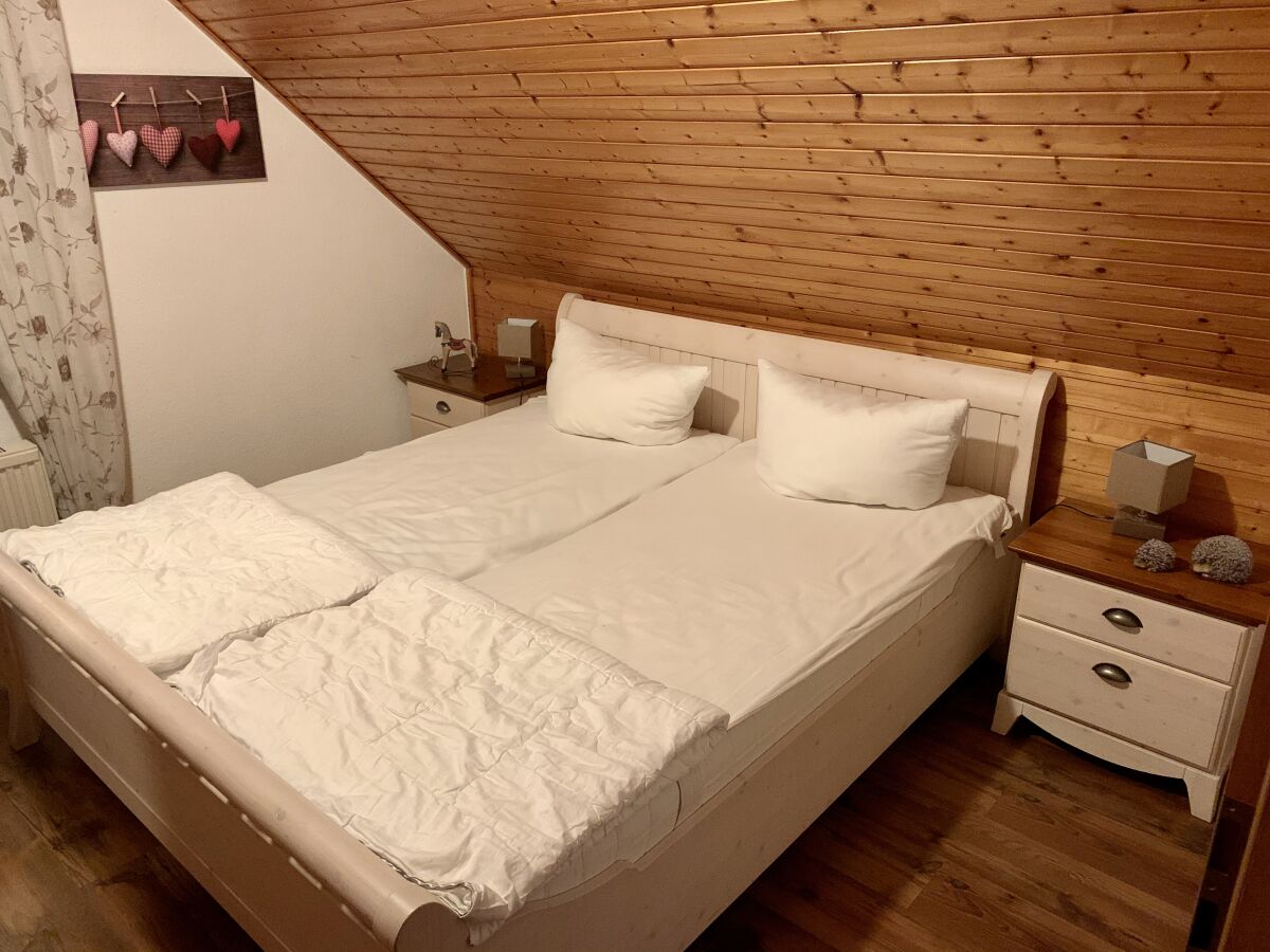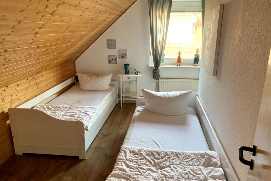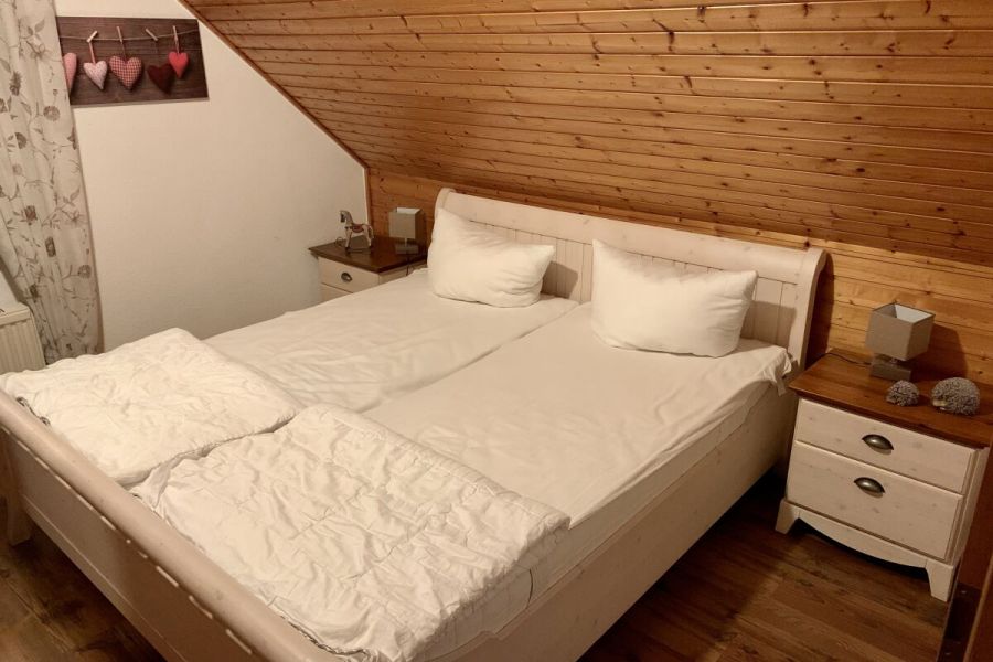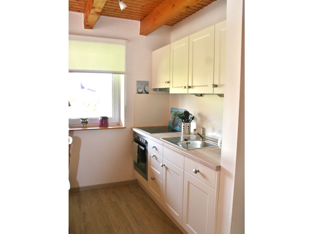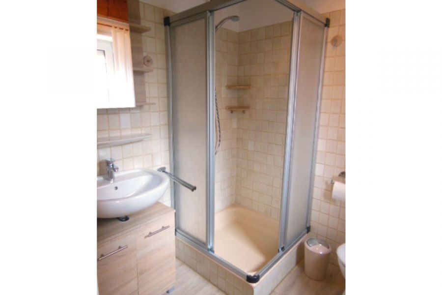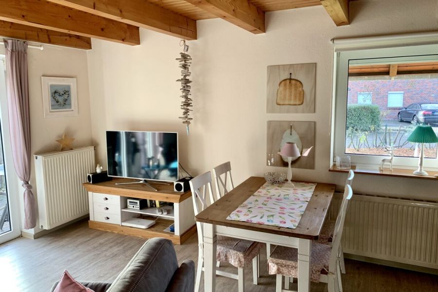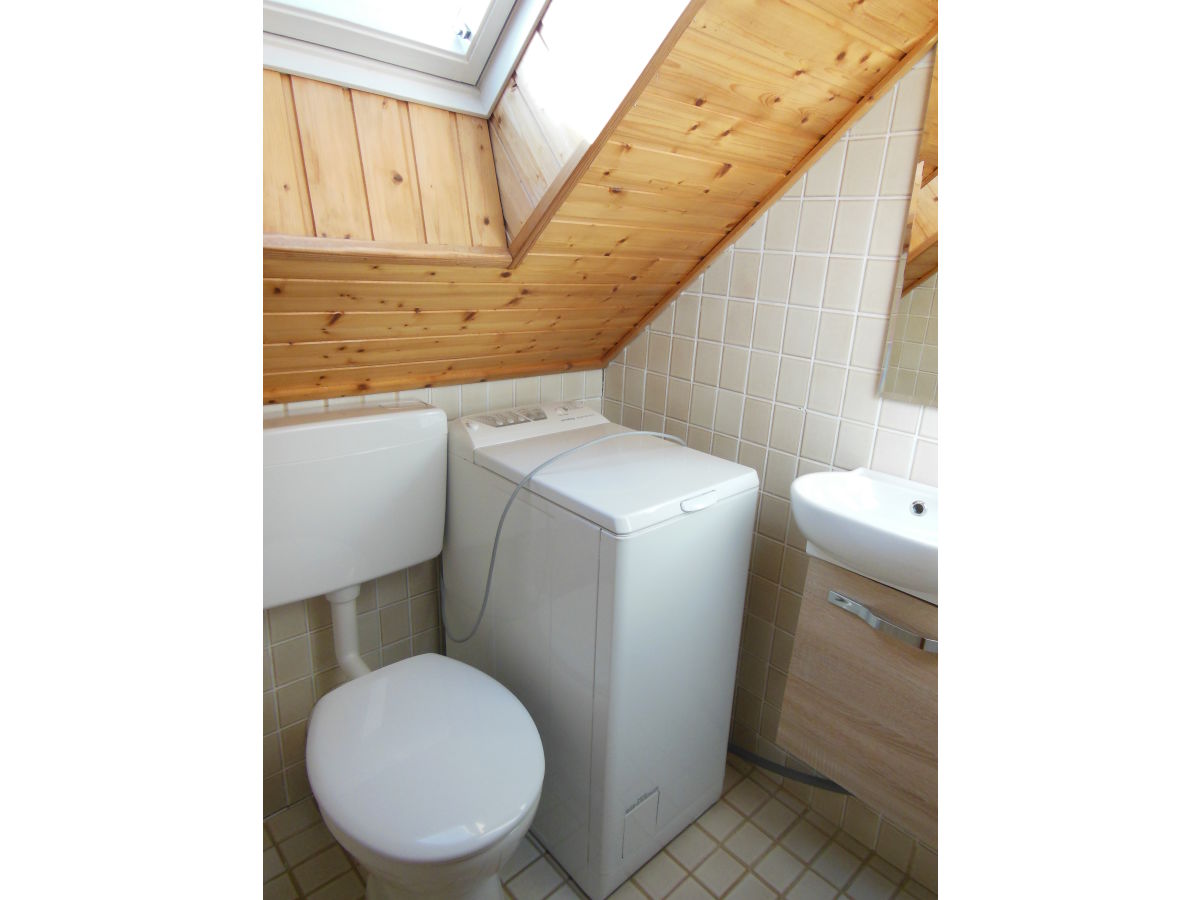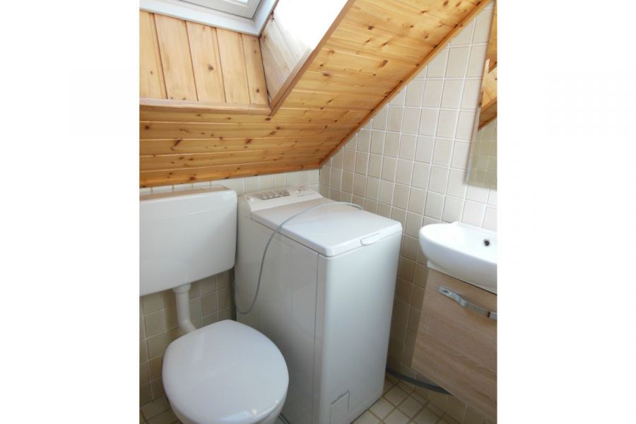 Im Erdgeschoss befindet sich der Wohn- und Essbereich mit TV und DVD-Player, die gut ausgestattete Küchenzeile und das Badezimmer mit Dusche. Die beiden Schlafzimmer, eines mit Doppelbett und eines mit zwei Einzelbetten, sowie ein Kinderreisebett und ein Gäste-WC mit Waschmaschine befinden sich im Dachgeschoss. Alle Schlafräume sind mit Außenjalousien ausgestattet. . Ein PKW-Stellplatz ist direkt am Haus.