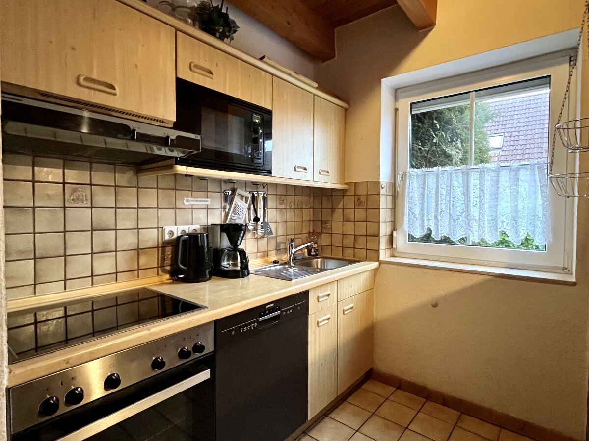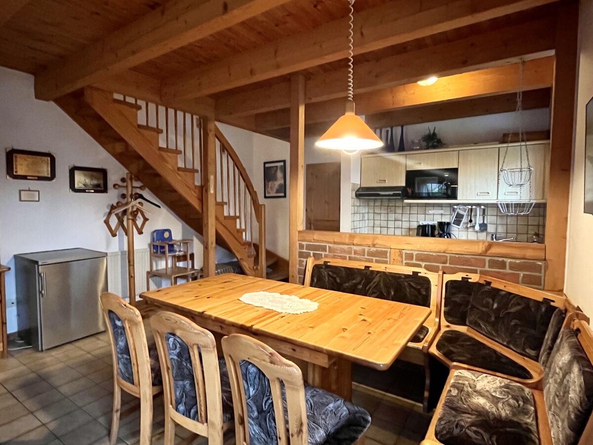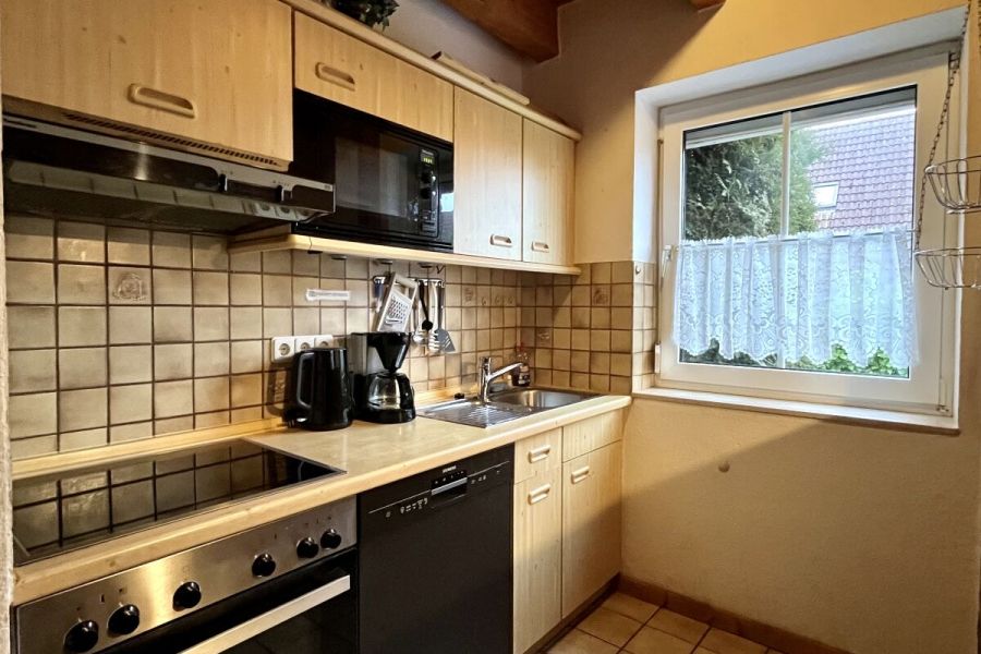Im unteren Bereich gibt es einen gemütlichen Wohnbereich mit Essecke und angrenzende Küche. Die Küche ist mit einer Spülmaschine, Mikrowelle, Backofen, 4-Platten E-Herd und einem Kühlschrank ausgestattet. Ein WC und Waschmaschine befindet sich ebenfalls im Erdgeschoss. Hier finden Sie auch einen Abstellraum.