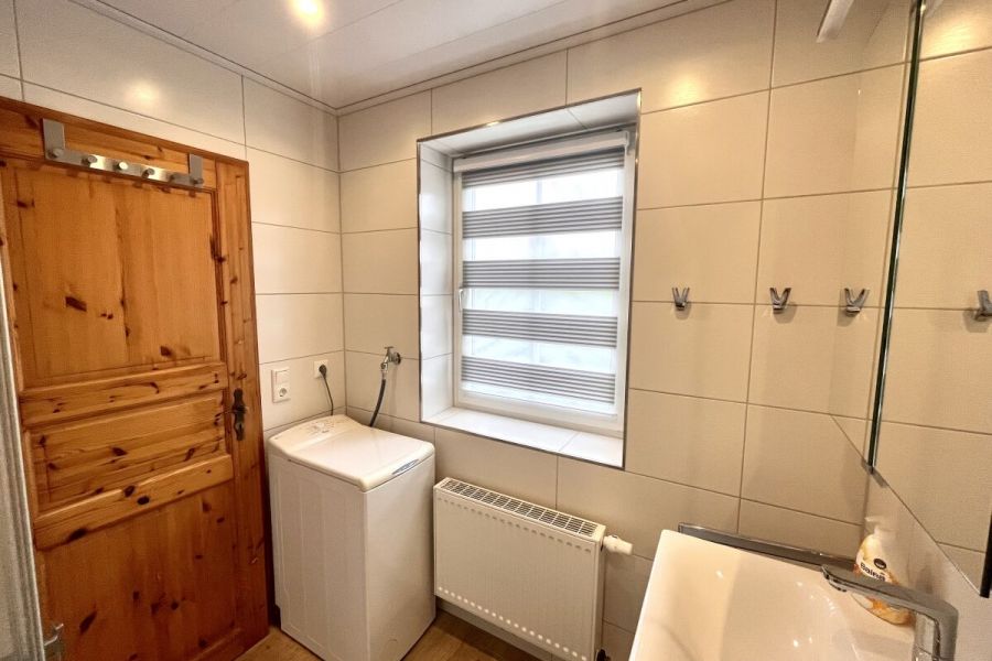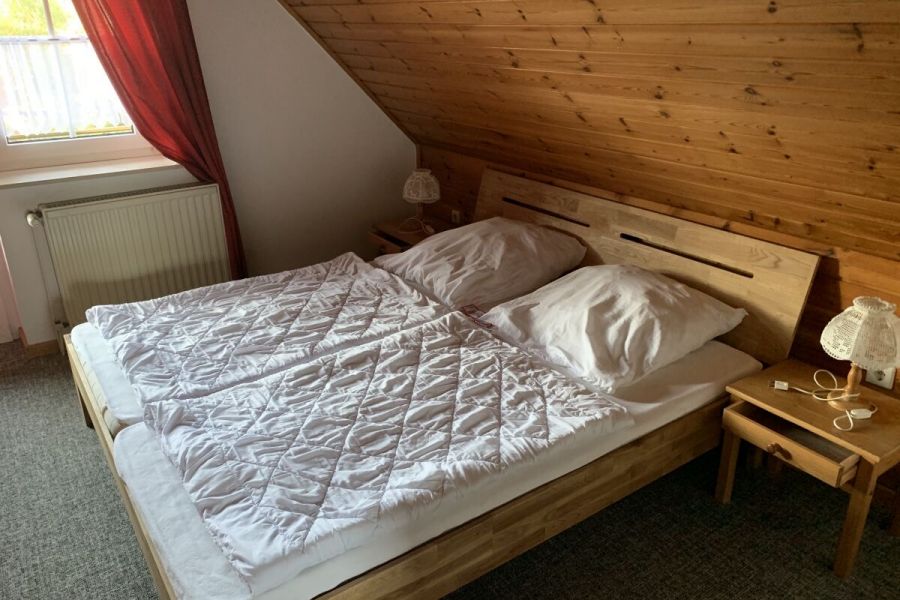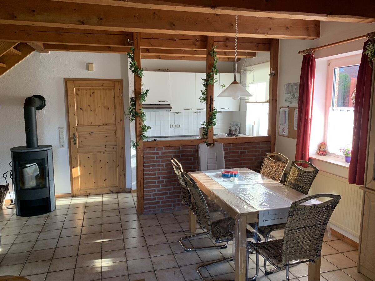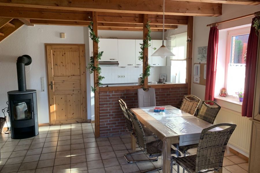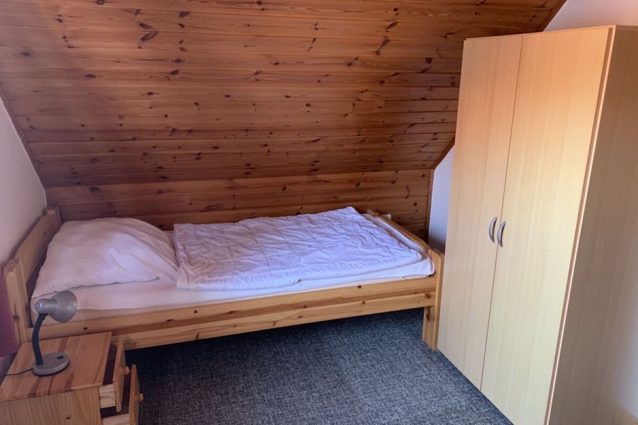 Im unteren Bereich befindet sich der Wohn-und Essbereich mit anliegender gut ausgestatteter Küchenzeile. Weiter Im Erdgeschoss befindet sich ein Badezimmer mit Dusche und Waschmaschine sowie ein Schlafzimmer mit einem Hochbett. Zwei weitere Schlafräume, eines mit Doppelbett und eines mit zwei Einzelbetten, sowie ein Kinderreisebett und ein Gäste-WC sind in der 1.Etage. Für die kalten Wintertage steht Ihnen ein Kaminofen zur Verfügung.
