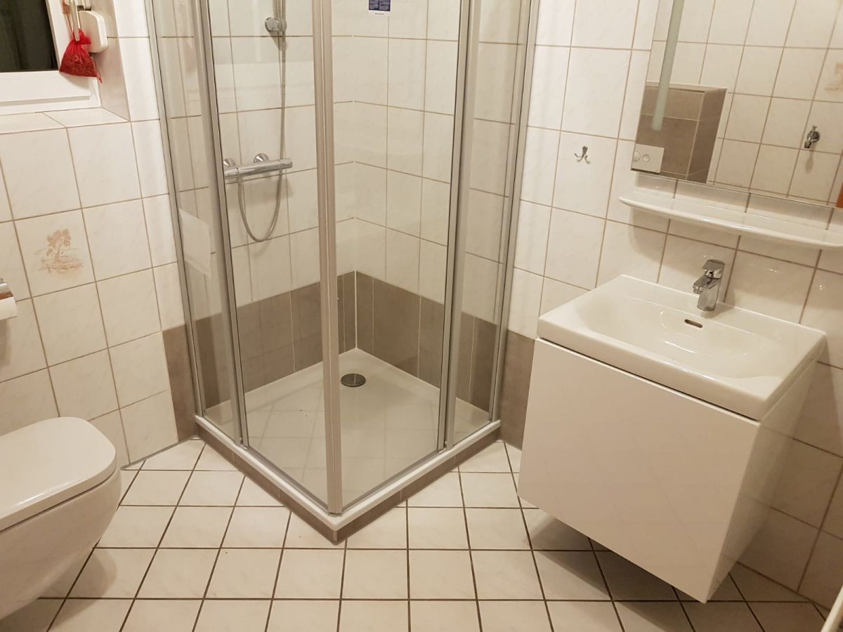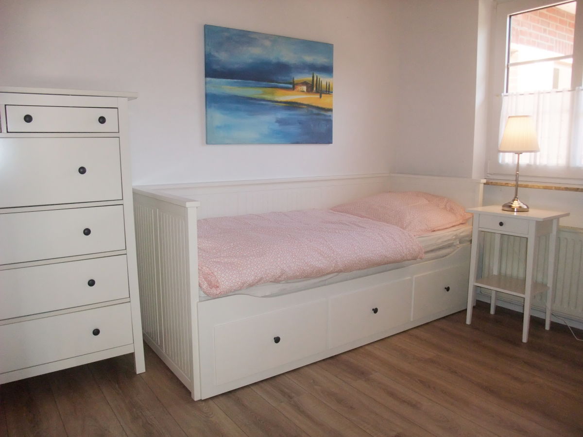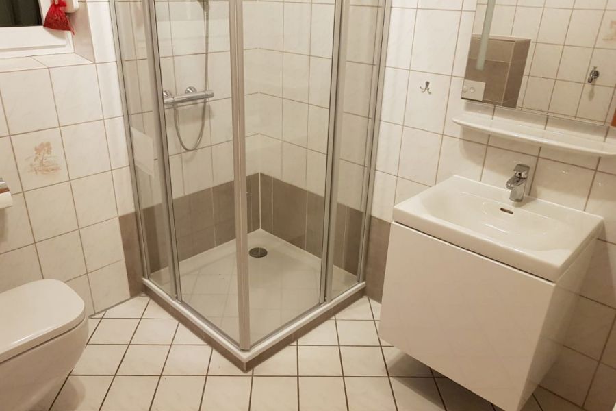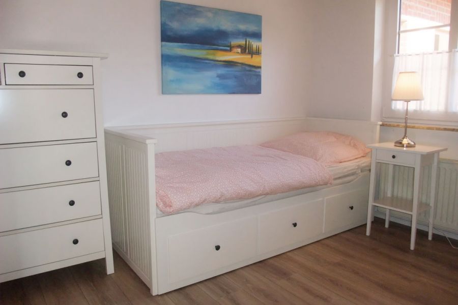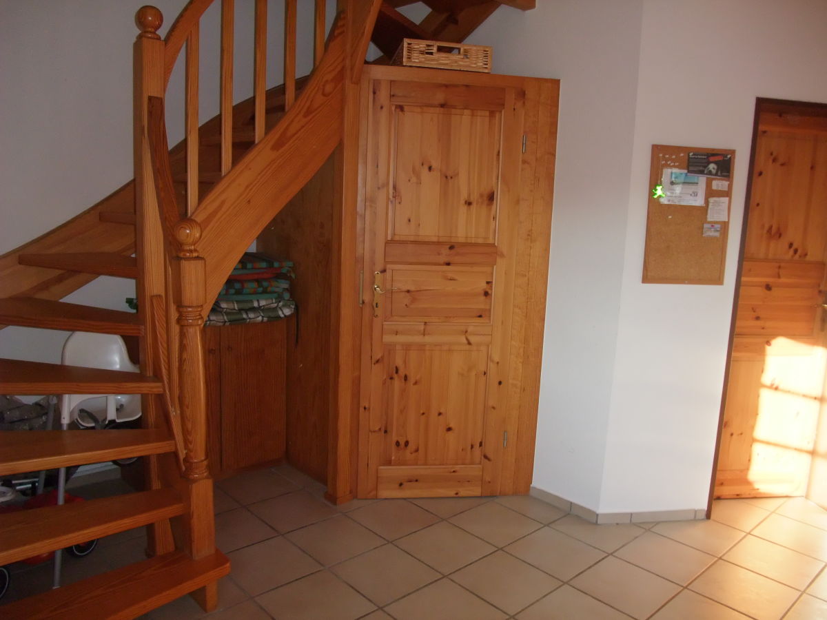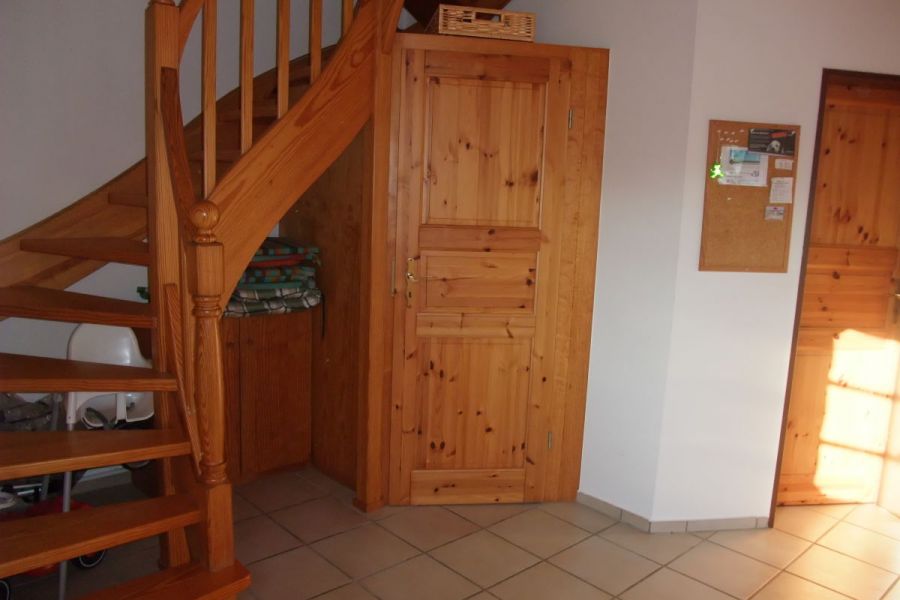 Im Erdgeschoss werden Sie im großzügigem Eingangsbereich empfangen. Von hier aus gelangen Sie in jeden Raum. Hier befinden sich vier Räume, beginnend mit einem Abstellschrank, wo Sie Reinigungsutensilien und den WLAN-Router auffinden. Eine Tür weiter, treten Sie in das Gästezimmer, mit einem Einzelbett, was aber auf Wunsch zu einem Doppelbett (160cm x 200cm) erweiterbar ist und einer kleinen Kommode. Im nächsten Raum finden Sie das neuwertige Badezimmer. Dieses ist mit einer Dusche, einer Toilette und einer Waschmaschine ausgestattet. Die offene Küche, mit Wohn- und Essbereich lädt für die ganze Familie ein. Alle alltäglichen Küchenutensilien sind hier auffindbar und laden zum gemeinsamen Kochen ein. Ein Fernseher, als auch ein DVD-Player, steht Ihnen im Wohnbereich zur Verfügung. Das Erdgeschoss wird mit dem Zugang zur Terasse, die mit Gartenmöbeln und einem kleinen abgezäunten Garten ausgestattet ist, abgerundet.